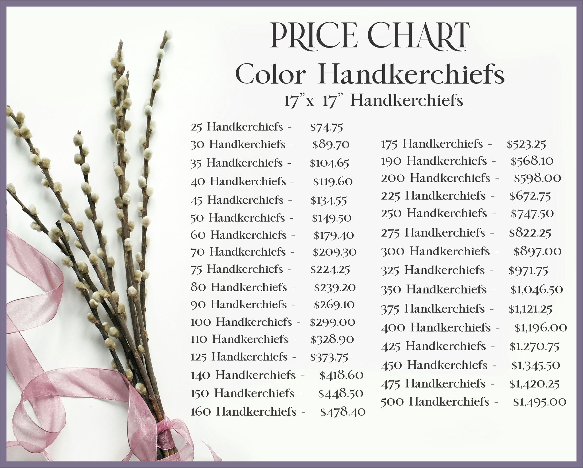 We offer black, gold, silver, blush, beige, sage green, and navy blue handkerchiefs in 17" x 17" size only. Personalize your handkerchiefs with names, dates, or any message you desire. Choose from our selection of artwork, provide your own artwork, or use your business logo.