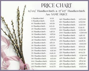 Available in two sizes: 14" x 14" and 17" x 17". Personalize your handkerchiefs with names, dates, or any message you desire. Choose from our selection of artwork, provide your own artwork, or use your business logo