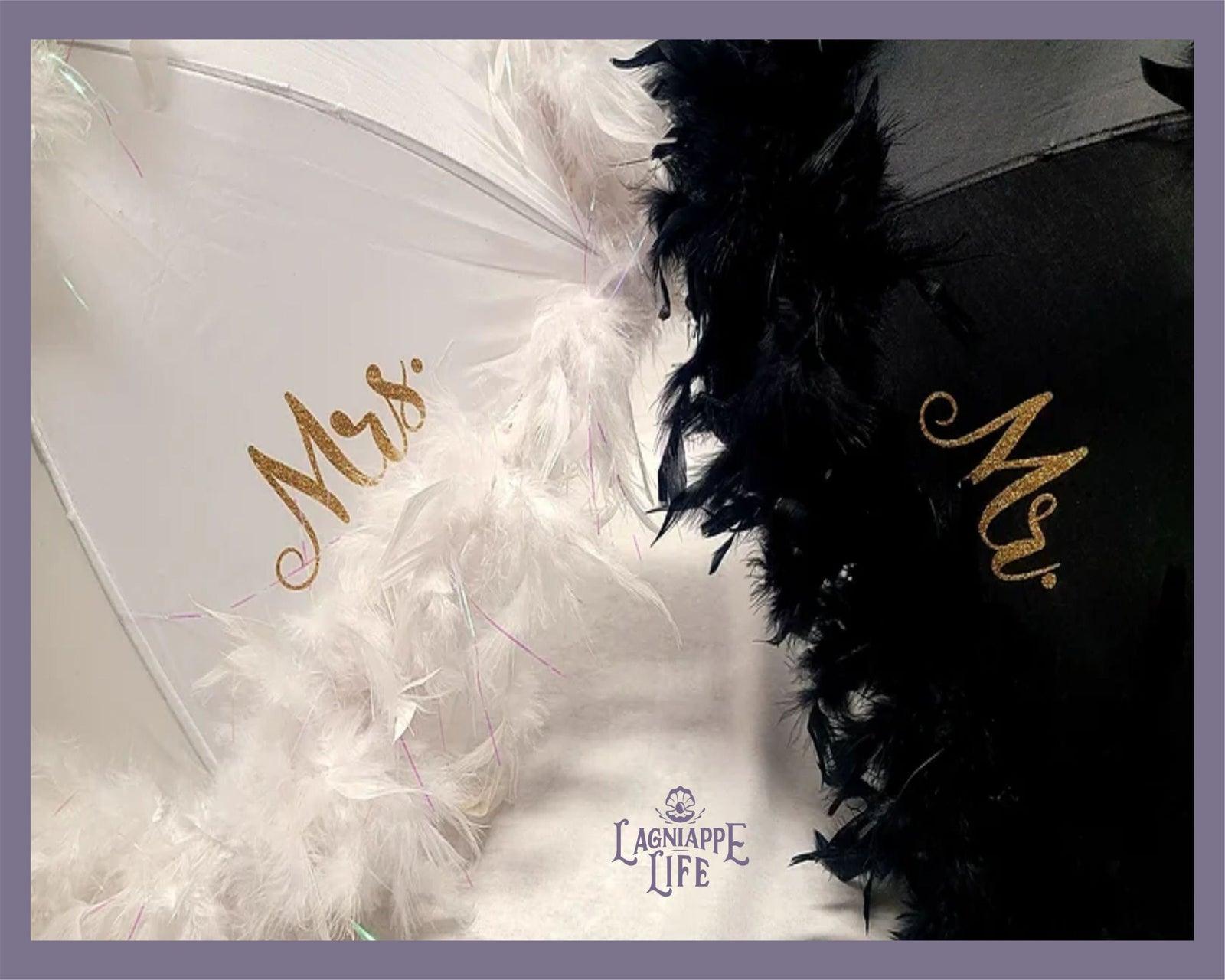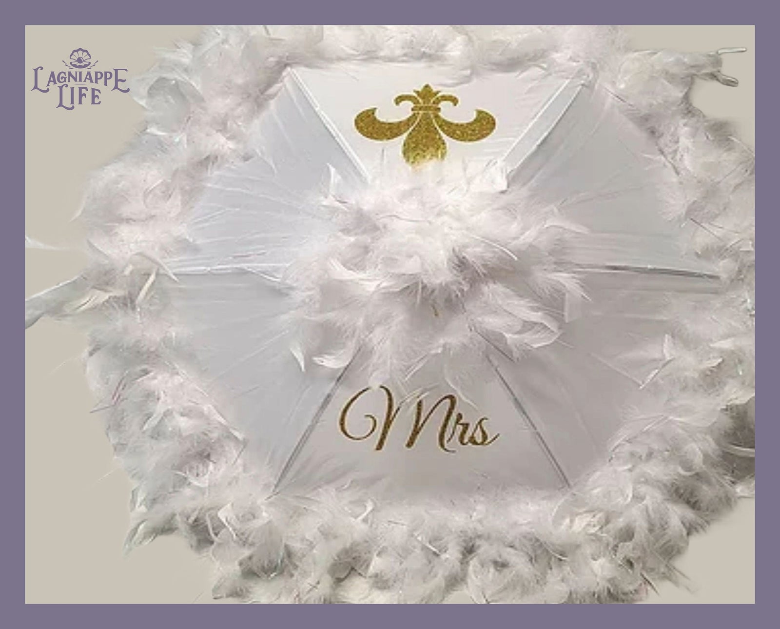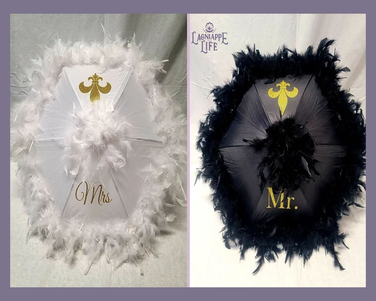 Second Line Umbrellas - Bride & Groom Set of 2 - 19" Umbrellas - FEATHERS - Fleur-De-Lis - Mr/Mrs or Bride/Groom